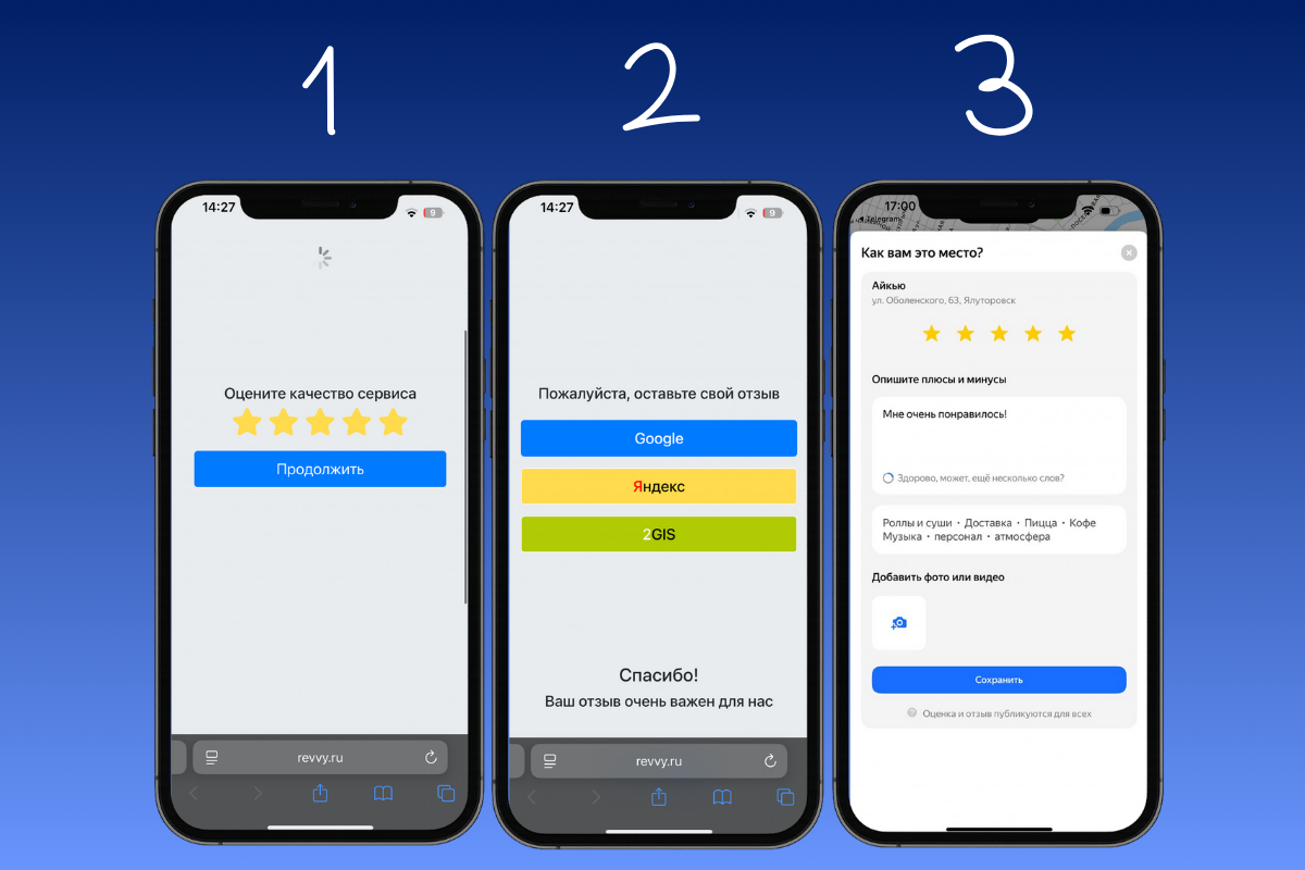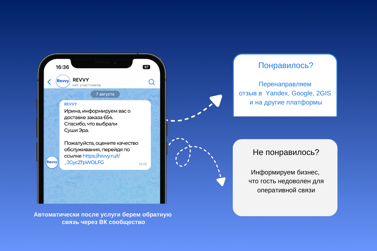 Представьте: человек сделал заказ в ресторане или посетил клинику, и уже через несколько минут получает удобное уведомление прямо в приложении. Ему не нужно ничего искать, достаточно одного клика, чтобы оставить отзыв. Для бизнеса это значит — больше обратной связи, выше рейтинг и реальная возможность быстро реагировать.